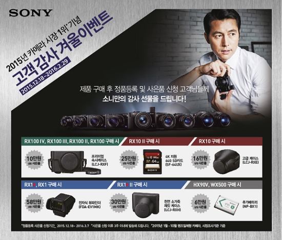 이벤트 기간 동안 해당 제품을 구매하고 내년 3월 7일까지 소니 고객지원 사이에서 정품 등록 및 이벤트 신청을 마치면 제품에 따라 전자식 뷰파인더(FDA-EV1MK), 천연 소가죽 재킷 케이스(LCJ-RXH), 고급 케이스(LCJ-RXE), 프리미엄 속사 케이스(LCJ-RXF), 4K 동영상 촬영이 가능한 SDXC 메모리 카드(SF-64UX), 추가배터리(NP-BX1) 등 푸짐한 사은품을 받을 수 있다.