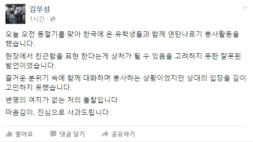 김 대표는 이날 자신의 페이스북에 공식사과문을 올리고 “현장에서 친근감을 표현한다는 게 상처가 될 수 있음을 고려하지 못한 잘못된 발언이었다”며 “즐거운 분위기 속에 함께 대화하며 봉사하는 상황이었지만 상대의 입장을 깊이 고민하지 못했다”고 밝혔다.