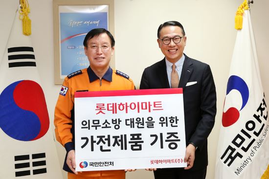 "[쿠키뉴스=구현화 기자] 롯데하이마트는 23일 서울 종로구 정부서울청사에서 이동우 대표이사, 조송래 중앙소방본부장이 참석한 가운데 의무소방대원을 위한 가전제품 전달식을 가졌다. 이 날 전달된 TV, 냉장고, 세탁기 등 3000만원 상당의 가전제품은 경기지역 소방서 내 의무소방대원이 생활하고 있는 생활관 14 곳에 전해진다.