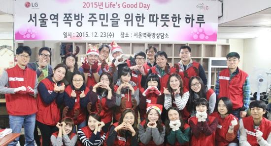 LG전자 임직원 봉사자들은 23일 기업의 사회적 책임(CSR, Corporate Social Responsibility) 활동의 일환으로 서울역 쪽방촌 300여 가구에 직접 만든 밑반찬과 치약, 칫솔, 비누 등 생필품이 들어있는 선물세트를 전달했다.