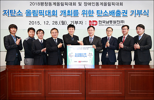 [쿠키뉴스=박주호 기자] 한국남동발전㈜은 28일 2018 평창동계올림픽 및 장애인동계올림픽대회 조직위원회(위원장 조양호)에 UNFCCC CDM(유엔기후변화협약 청정개발체제)사업 탄소배출권 6만톤을 기부했다고 밝혔다.