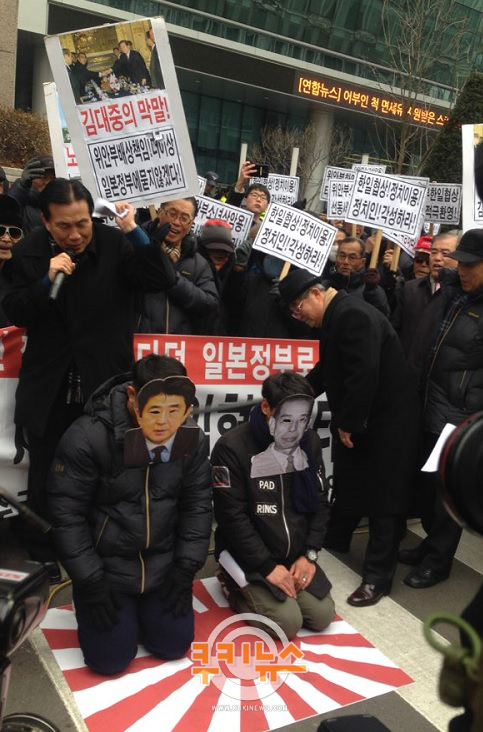보수단체는 또 ‘일본 정부의 위안부 사과를 환영한다’는 내용의 성명을 발표, 전범기를 찢고 아베 총리와 그의 외조부 기시 노부스케를 매질하는 퍼포먼스를 벌이기도 했다. min@kmib.co.kr