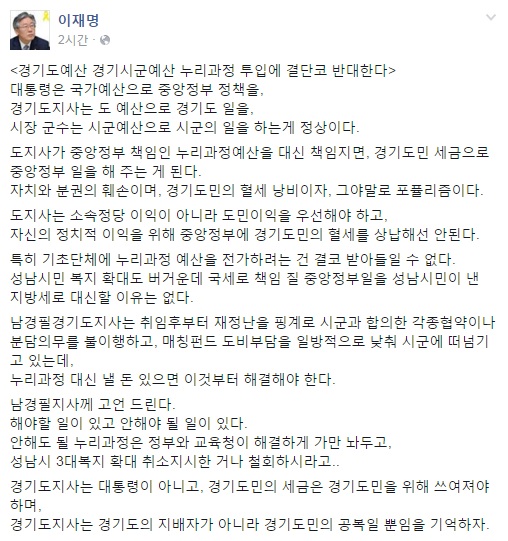 이 시장은 10일 자신의 페이스북을 통해 “도지사가 중앙정부 책임인 누리과정 예산을 대신 책임지면 경기도민 세금으로 중앙정부 일을 해주는 게 된다”며 “자치와 분권의 훼손이며 경기도민의 혈세 낭비이자 포퓰리즘”이라고 주장했다.