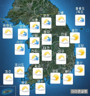 아침 최저기온은 서울 -9도, 부산-2도, 대구 -3도, 대전 -5도, 광주 -3도, 춘천 -12도, 제주 3도 등이며 낮 최고기온은 서울 0도, 부산 6도, 대구 4도, 대전 2도, 광주 3도, 춘천 1도, 제주 6도 등이다.