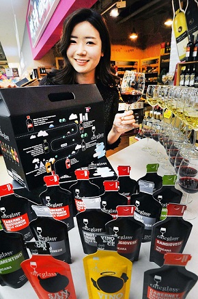 "[쿠키뉴스=구현화 기자] 2일 홈플러스 영등포점에서 모델이 ‘원글라스 파우치 와인 기획세트’를 선보이고 있다. 홈플러스는 이색 설 선물세트로 ‘원글라스 파우치 와인 기획세트’를 마련, 다양한 종류의 와인을 100ml씩 미니 파우치 16개에 담아 5만원에 판매한다. 와인은 까베네쇼비뇽, 산지오베제(각 4개), 베르멘티노, 피노그리지오(각 3개), 비노돌체, 상그리아(각 1개) 등으로 구성했다.