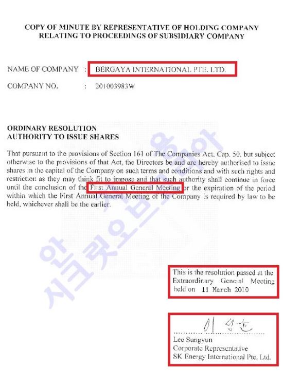 SK계열사가 된 버가야는 주주총회를 열어 9만9999주로 증자하고 자본금을 10만 싱가포르달러로 늘렸다. 신주발행을 결의한 주총 회의록에는 SK에너지 인터내셔널을 대표해 이모 사장이 사인한 내용이 담겨 있다. 버가야인터내셔널을 SK계열사로 편입한 사람이 이씨인 것이다.