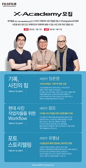 2014년부터 시작한 ‘X-아카데미’는 후지필름의 프리미엄 하이엔드 카메라인 X시리즈로 작업하는 X-포토그래퍼스(X-Photographers)와 함께 사진을 보다 깊이 있고 체계적으로 배울 수 있는 프로그램으로 호평을 얻고 있다. 지난 2년간 사진을 비롯한 비주얼 아트로 명성이 높은 미국 로체스터대 대학원 합격생, 계원예대 사진예술학과 포트폴리오 전형 수석 합격생 등을 배출하며 예비 사진가 양성소로 성장하고 있다.