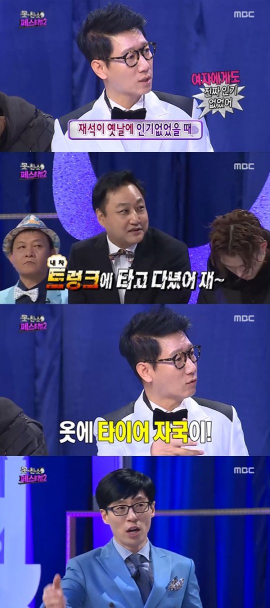 지석진은 유재석이 투표를 하러 간 사이에 “쟤 예전에 여자들한테 인기 진짜 없었다”고 과거를 언급했다. 이에 선배 개그맨인 김수용 역시 “내 트렁크를 타고 다녔다”고 폭로했다. 지석진은 “흰티 입었는데 트렁크 타고 타이어 자국이…”라고 말을 흐려 폭소를 유발했다.