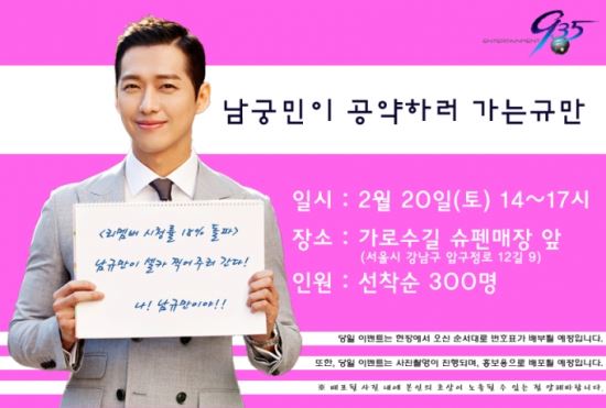 19일 소속사 935엔터테인먼트 측은 “남궁민이 시청률 공약 이행을 위해 팬들과 셀카를 찍으러 간다”며 “2월 20일 토요일 오후 2시부터 선착순 300명에게 직접 셀카를 찍어주며 간단한 선물도 전달 예정이다”라고 전했다. 장소는 신사동 가로수길 인근 신발 매장에서 진행된다.