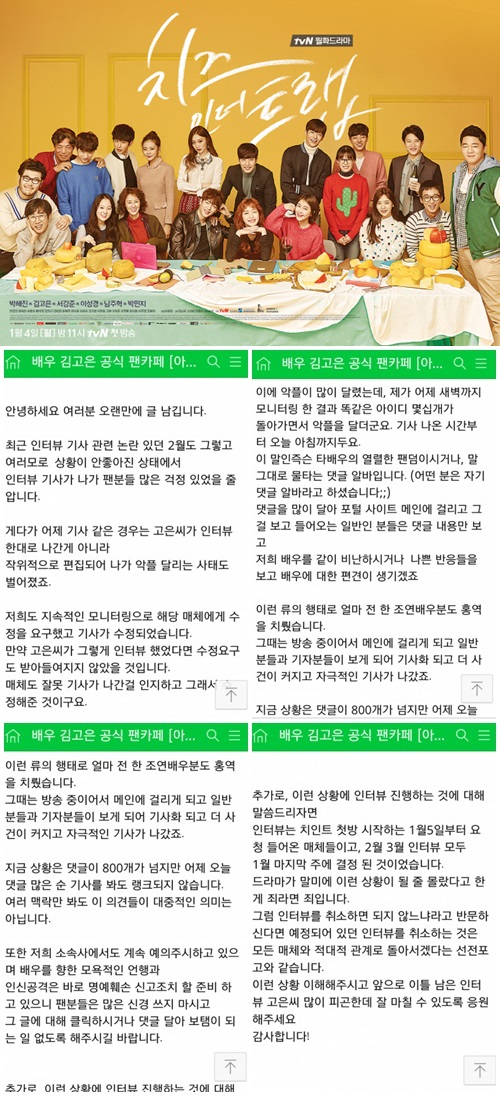 으레 드라마가 끝나면 배우들은 드라마에 관해 후기를 전하는 인터뷰를 진행하곤 합니다. 김고은이 했던 인터뷰도 비슷한 맥락이었죠. 이 중 한 매체와 함께한 인터뷰가 화근이 됐습니다. 해당 인터뷰에서 김고은은 ‘치즈인더트랩’에 관해 “배우가 작품 외적으로 논란이 돼 아쉽다”고 밝혔습니다. ‘치즈인더트랩’은 감독을 맡은 이윤정 PD와 주연배우 박해진의 불화설이 돌아 작품 후반에 불협화음을 보였죠. 이윤정 감독의 일부 배우에 대한 호의, 박해진과 촬영한 분량을 일방적으로 편집한 처사 등을 비롯해 원작자 순끼에 대한 배려까지 부족해 뒷말을 낳았습니다. 드라마 자체는 꽤 잘 만들었다는 평을 들었던 만큼 출연한 배우 입장에서는 충분히 아쉬울 수 있는 부분이었죠.