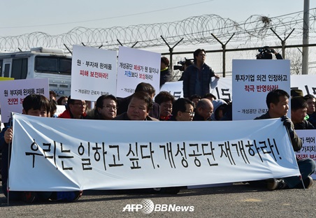 16일 오후 경기도 파주시 통일대교에서 개성공단 입주기업과 협력기업 임직원과 가족들이 '개성공단 평화대행진'을 하던중 집회를 하고 있다. (사진=ⓒAFP BBNews=News1)