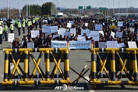 16일 오후 경기도 파주시 통일대교에서 개성공단 입주기업과 협력기업 임직원과 가족들이 '개성공단 평화대행진'을 하던중 집회를 하고 있다. (사진=ⓒAFP BBNews=News1)