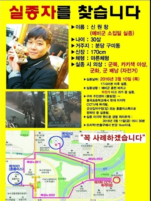 실종된 예비군 신원창씨, 흰색 끈으로 목매 숨져…“타살여부 조사중”