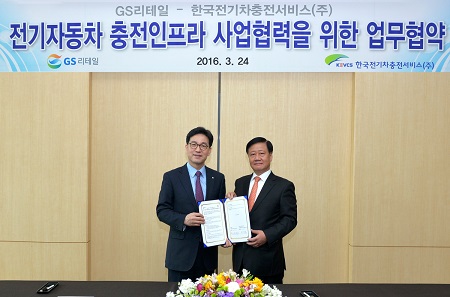 GS리테일은 이달 24일 한국전기차충전서비스와 전기차 충전 인프라 구축 사업에 관한 전략적 제휴 업무협약(MOU)을 진행했다. 앞으로 양사는 전기 자동차 시장 확대를 위한 충전 인프라 구축 협력 등에 인적 교류를 진행한다.