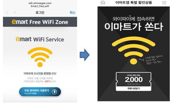 기존에 ‘이마트앱’을 설치한 고객은 이마트 점포에서 와이파이에 접속하면 자동으로 할인쿠폰 다운로드 화면으로 이동한다. 미 설치 고객의 경우 할인쿠폰 다운로드 화면을 클릭 시 ‘이마트앱’ 설치 화면으로 이동 후 이용 가능하다.