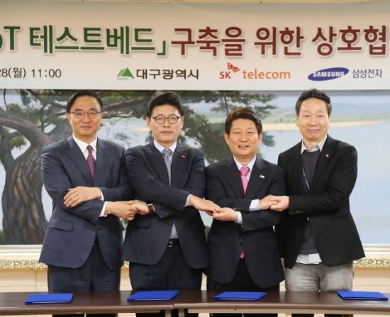 이날 권영진 대구시장, 이형희 SK텔레콤 사업총괄, 김영기 삼성전자 사장, 김선일 대구창조경제혁신센터장 등은 28일 대구광역시 청사에서 ‘대구 IoT 테스트베드’ 구축을 위한 IoT 인프라 구축, 에너지 효율화, 상생펀드를 통한 벤처 스타트업 지원 등의 실행 전략을 발표했다.