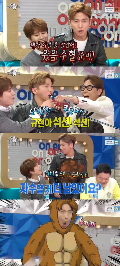 "왜 여기 온 것이냐. 자수할 것 더 남았냐"고 유세윤을 견제하며 폭소를 유발했다. 규현은 유세윤이 2013년 음주운전 물의를 빚어 '라디오스타' MC에서 하차한 후 합류한 멤버라 더 큰 웃음을 자아냈다.