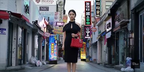 이 사진은 어깨가 드러나는 검은 원피스를 입고 하이힐을 신은 여성이 레이디 디올 백을 들고 유흥가 앞에 서 있는 모습을 표현한 합성사진인데 배경에는 '소주방', '룸비 무료', '파티타운' 등의 글귀를 담은 유흥주점 간판이 보인다.