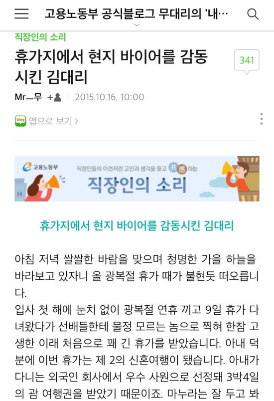 지난 16일 뒤늦게 한 언론사의 기사화로 화제가 된 글이 있습니다. 바로 고용노동부 공식블로그에 실린 ‘휴가지에서 현지 바이어를 감동시킨 김대리’입니다. 해당 글은 지난해 10월 올라왔지만 6개월이 넘은 지금 화제가 됐습니다. 화제보다는 논란이라고 해야 할까요? 바로 글의 내용 때문입니다.