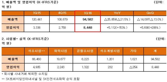 전분기 대비 매출액은 유가 하락에 따른 제품 가격 하락으로 전년 동기 대비 13%(1조 4097억원)감소했으나 영업이익은 206%(5690억원) 증가했다.