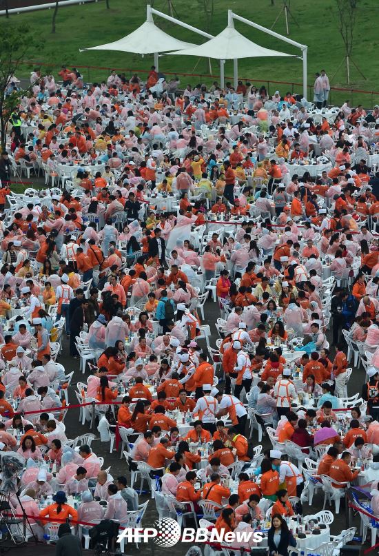 중국인 관광객(유커) 중마이과학발전유한공사 직원 4000명이 6일 오후 7시 반포한강공원 달빛광장에 마련된 축구장 3배 면적의 만찬장에서 삼계탕 파티를 벌였다.