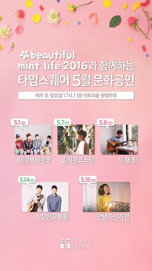 5월 첫째주에는 인기 뮤지션 ‘데이브레이크’, ‘빌리어코스터’, ‘정재원’ 등이 출현해 사전 공연을 마쳤으며 다가오는 14일에는 어쿠스틱 댄싱 듀오 ‘소심한 오빠들’의 유쾌한 무대를, 15일은 ‘좋아서 하는 밴드’의 멤버 ‘안녕하신가영’의 달달한 공연을 만나볼 수 있다. 이번 주말에 올림픽 공원에서 펼쳐지는 ‘뷰티풀 민트 라이프 2016’ 뮤직페스티벌에 가지 못한 고객들도 문화공연을 통해 타임스퀘어에서 축제 분위기를 즐길 수 있다.