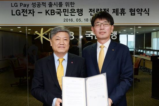 [쿠키뉴스=구현화 기자] LG전자가 18일 국민은행 세우회 본점에서 KB국민은행과 차세대 모바일 결제서비스 ‘LG페이’를 위한 전략적 업무제휴를 체결했다.