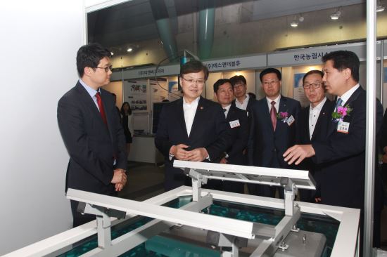 [쿠키뉴스=구현화 기자] 23일 오후 충남 천안아산역에 위치한 충남창조경제혁신센터에서 최양희미래부장관(왼쪽 두 번째), 김용욱 한화S&C 대표(오른쪽 첫번째), 이병우 충남창조경제혁신센터장(오른쪽 두번재), 허승욱 충남부지사(왼쪽 세번째) 등 참석자들이 수상 태양광 발전 개발업체인 ‘이-플로트’ 박정욱 대표(맨 왼쪽)에게 수상 태양광 발전설비에 대한 설명을 듣고 있다. kuh@kukinews.com