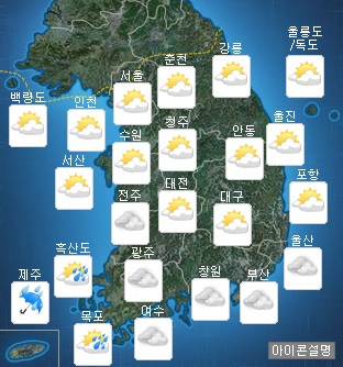 기상청에 따르면 중부지방은 중국 산둥반도 부근에 위치한 고기압의 가장자리에 들어 구름이 많겠고 남부지방은 제주도 남쪽해상을 지나는 기압골의 영향을 받아 대체로 흐리겠다.