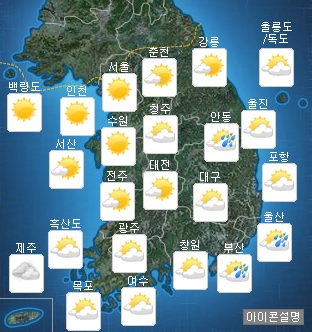 아침 사이에는 서해안과 중부내륙을 중심으로 안개가 짙게 끼는 곳이 있어 교통안전에 유의해야 한다.