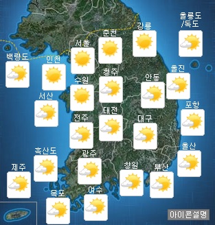 아침 최저기온은 서울 19도, 부산 20도, 대구 18도, 대전 18도, 광주 19도, 제주 19도, 울릉·독도 17도 등이고 낮 예상 최고기온은 서울 31도, 부산 25도, 대구 30도, 대전 31도, 광주 30도, 제주 26도, 울릉·독도 22도 등이다.