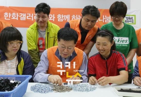16일 황용득 대표이사와 한화갤러리아 임직원 봉사단은 강화도 우리마을을 방문해 쌀 450kg을 전달했다. 또 두 팀으로 나누어 각각 우리마을의 수익사업 중 하나인 부품조립 작업을 지원과 시설의 환경정화 활동을 진행했다.