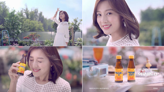 새 광고에서 김지원은 따뜻한 햇살을 맞으며 아로골드D를 마시는 모습으로 등장해 비타민 음료의 특성을 강조했다.