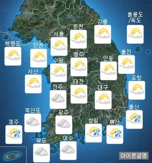 낮 예상 최고기온은 서울 31도, 인천 28도, 강릉 25도, 대전 29도, 광주 27도, 대구 27도, 부산 25도 등이다.