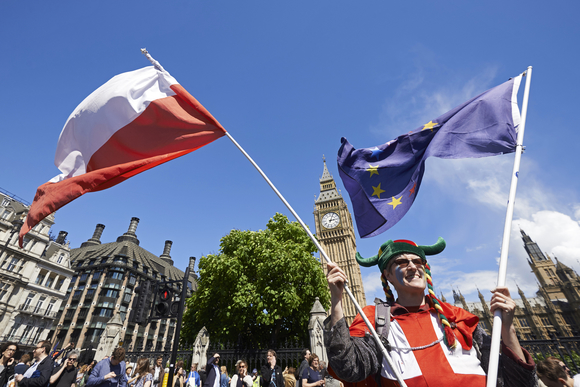 2일 영국 국회 앞 광장에서 브렉시트(영국의 EU 탈퇴) 반대 시위자들이 영국 국기와 EU 국기를 나란히 들고 흔들고 있다.