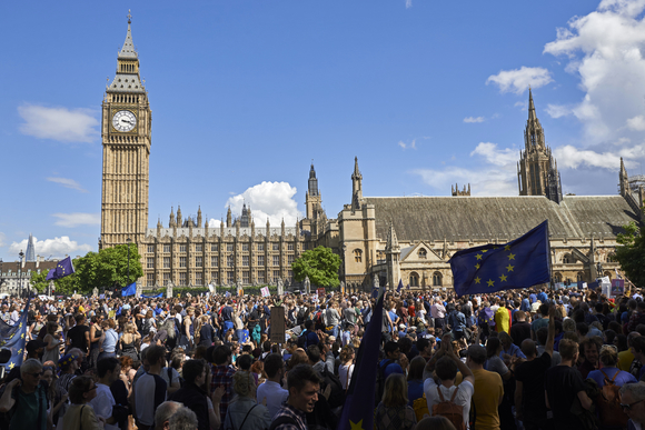 지난 2일 영국 국회 앞 광장에서 브렉시트(영국의 EU 탈퇴)에 반대하는 시위자들이 EU에 들어가기를 원하는 피켓과 EU 국기를 들고 시위를 벌이고 있다.