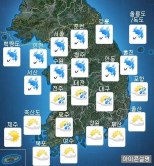 중부지방과 경북도에는 비(강수확률 60∼90%)가 오겠고, 그밖의 남부지방에는 낮부터 늦은 오후까지 가끔 비(강수확률 60∼70%)가 내릴 것으로 보인다.