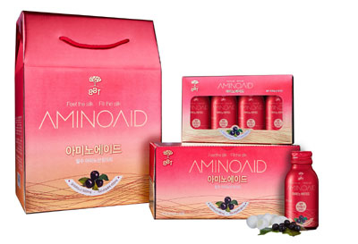아미노에이드는 아로니아가 함유된 실크아미노산 음료다. 주성분인 실크아미노산은 인체 세포의 성장과 소멸, 생리활성 기능에 직결된 필수아미노산 8종을 포함한 총 18종의 아미노산으로 구성됐다.