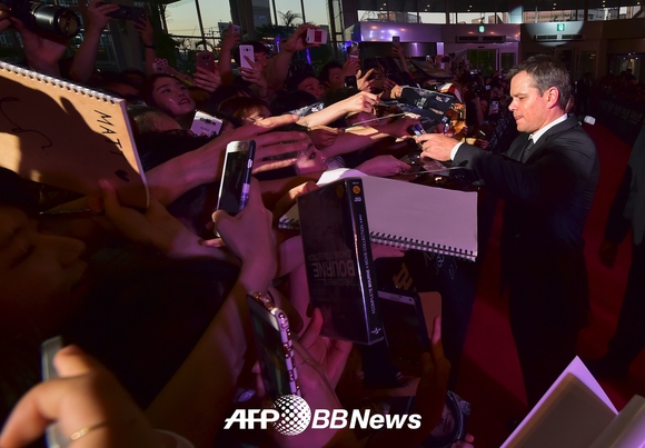 미국 출신 배우 맷 데이먼이 지난 8일 영화 '제이슨 본' 프로모션차 열린 레드카펫 행사에서 팬들과 만나고 있다.