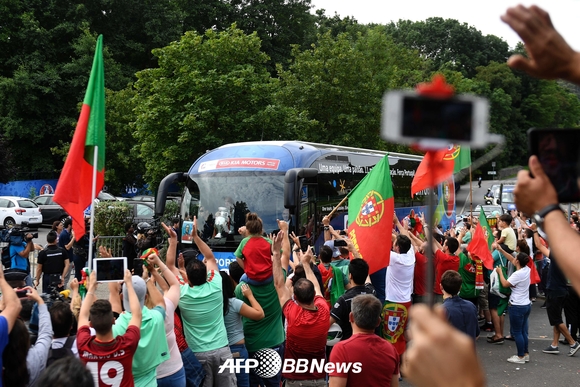 포르투갈 응원단이 11일 포르투갈 팀 베이스캠프 마코시스에서 포르투갈 국가대표팀을 태운 차에 모여 배웅하고 있다. 포르투갈 팀은 전날 UEFA 유로 2016 에서 최종 우승했다.