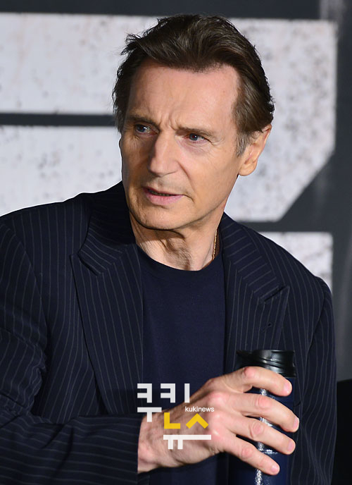 배우 리암 니슨이 13일 오전 서울 여의도 콘래드호텔에서 열린 영화 ‘인천상륙작전’(감독 이재한) 내한 기자회견에서 물을 마시고 있다.