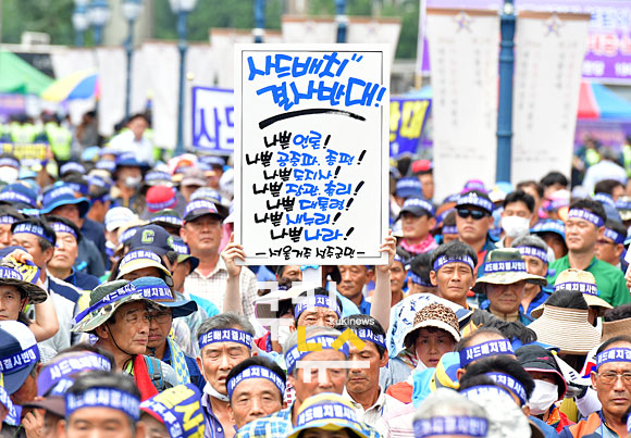경북 성주군민이 21일 오후 서울역 광장에서 열린 ‘고고도미사일방어체계(THAAD·사드) 배치 반대 집회’에서 구호를 외치고 있다. 박효상 기자 tina@kukinews.com