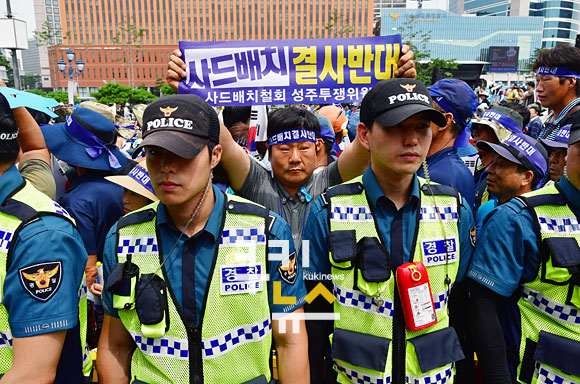 경북 성주군민이 21일 오후 서울역 광장에서 열린 ‘고고도미사일방어체계(THAAD·사드) 배치 반대 집회’에서 플래카드를 흔들고 있다. 박효상 기자 tina@kukinews.com