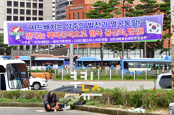 21일 오후 서울역 광장에서  ‘고고도미사일방어체계(THAAD·사드) 배치 반대 집회’가  열린 가운데 한 노숙인이 더위에 지쳐 고개를 숙이고 있다. 박효상 기자 tina@kukinews.com