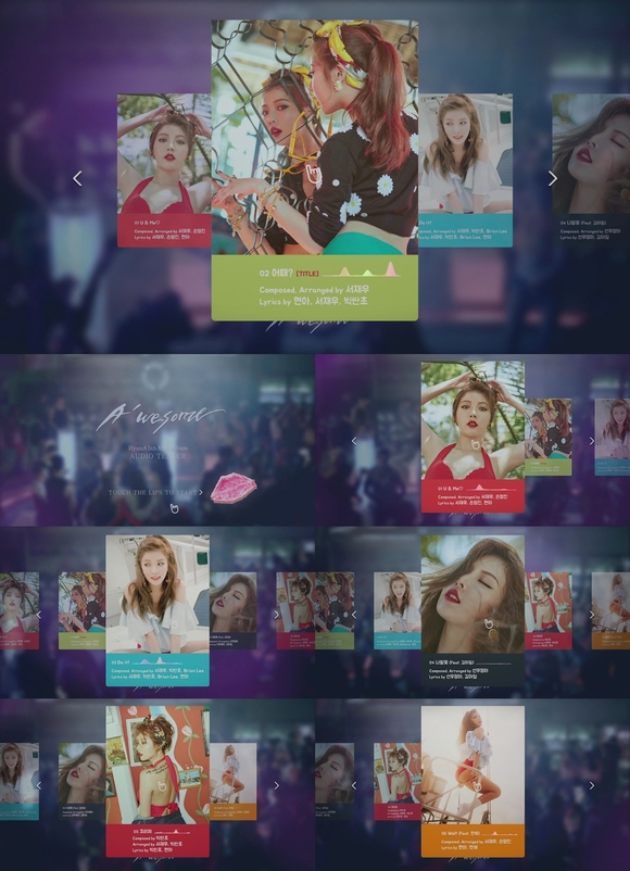 현아는 28일 오전 공식 유튜브 채널을 통해 미니 5집 '어썸(A'wesome)'의 전곡 오디오티저를 공개했다. 플레이리스트 그래픽으로 제작된 이번 오디오 티저에는 타이틀 곡 '어때?'를 포함, 총 6개 신곡의 하이라이트 음원이 공개됐다.