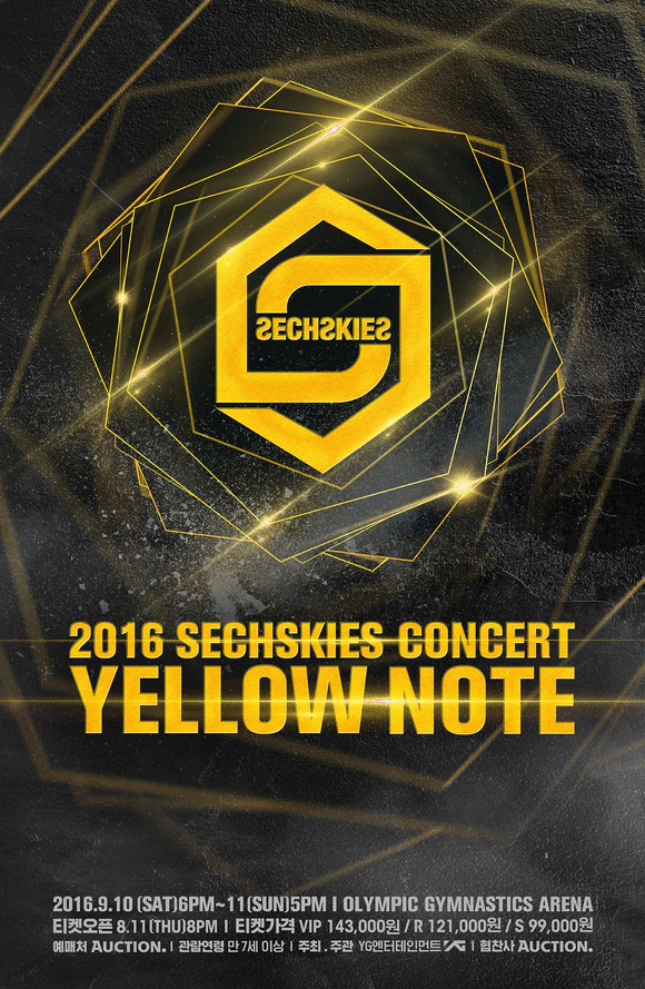 5일 오전 11시, YG 공식 블로그(www.yg-life.com)에는 젝스키스의 단독 콘서트 ‘2016 젝스키스 콘서트 옐로우 노트(SECHSKIES CONCERT YELLOW NOTE)’ 공식 포스터가 공개됐다. 공개된 이미지 속 로고를 비롯한 주요 디자인 모두 젝스키스 팬클럽을 상징하는 노란색으로 통일돼 눈길을 끈다.