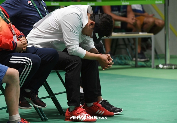 6일(현지시간) 2016 브라질 리우데자네이루 올림픽에서 남자 10m 권총사격 결승전이 열렸다. 이날 4번째로 탈락한 진종오가 고개를 떨구고 있다.