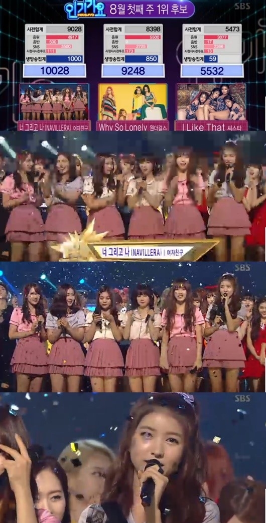 7일 방송된 SBS '인기가요'에 출연한 여자친구는 '너 그리고 나(NAVILLERA)'로 1위를 차지했다.