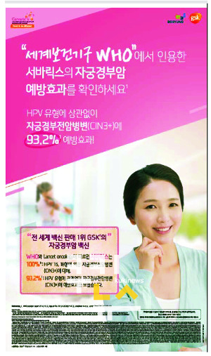 이런 가운데 GSK 서바릭스가 ‘세계보건기구(WHO)에서 인용한 서바릭스의 자궁경부암 예방효과를 확인하세요’ 광고(사진)가 논란을 빚고 있다. 최근 모 일간지에 게재된 광고에 따르면 서바릭스는 ‘HPV 유형에 상관없이 자궁경부전암병변(CIN3+)에 93.2% 예방효과’를 강조하고 있다.