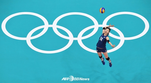 한국의 배구선수 양효진 선수가 8일 리우올림픽 발리볼 경기에서 볼을 서브하고 있다.